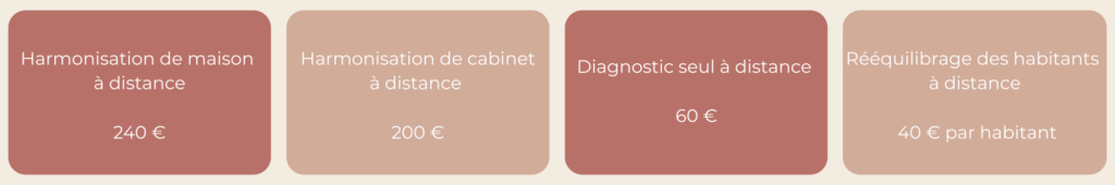 Ces tarifs comprennent le diagnostic, l’harmonisation, le compte-rendu écrit et vocal, une visio/ou appel pour répondre à vos questions si vous le souhaitez, ainsi que la vérification des énergies 3 à 4 semaines après. Le paiement possible en plusieurs fois.