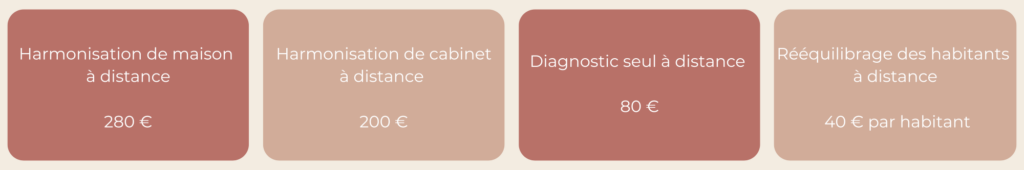 Ces tarifs comprennent le diagnostic, l’harmonisation, le compte-rendu écrit et vocal, une visio/ou appel pour répondre à vos questions si vous le souhaitez, ainsi que la vérification des énergies 3 à 4 semaines après. Le paiement possible en plusieurs fois.
